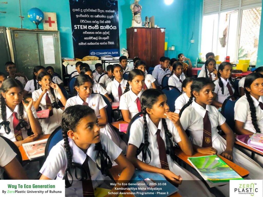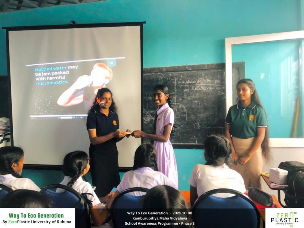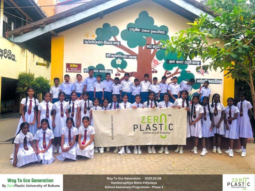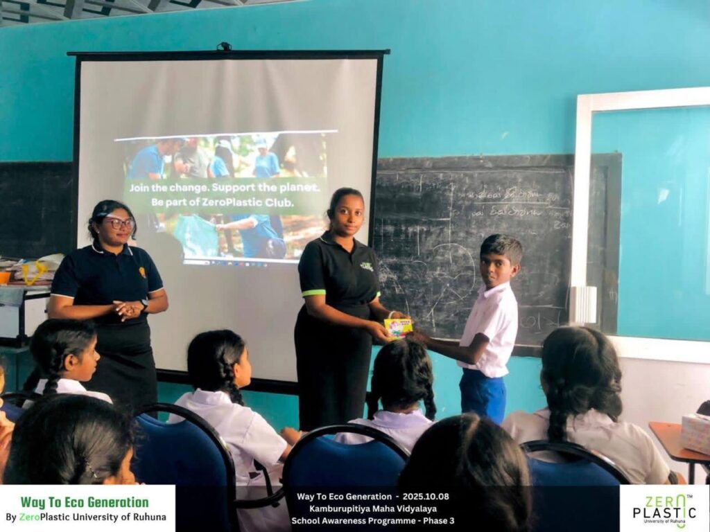 On October 8, 2025, the ZeroPlastic Club of the University of Ruhuna took another significant stride in shaping a sustainable future through its “Way to Eco Generation – School Awareness Programme.” This session, held at Kamburupitiya Maha Vidyalaya, aimed to educate young students on the environmental challenges posed by plastic and polythene waste — and how small, conscious actions can lead to lasting change.
