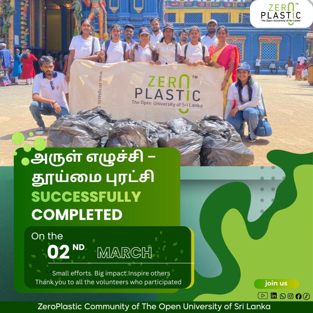 A successful community clean-up initiative titled “அருள் எழுச்சி – தூய்மை புரட்சி” (Arul Ezhuchi – Thooimai Puratchi) was organized by the ZeroPlastic Community of The Open University of Sri Lanka in conjunction with the annual Theru Festival at Matale Sri Muthumari Amman Devasthanam.